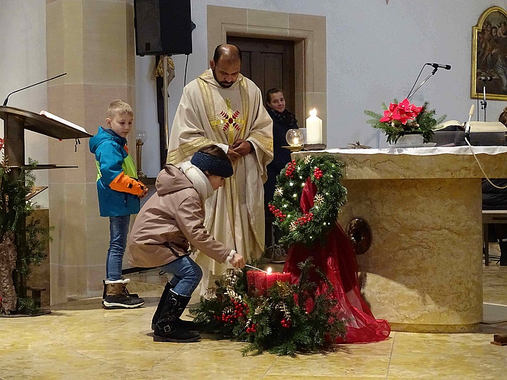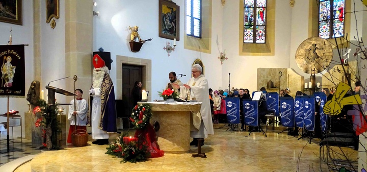 Mit einem feierlichen Gottesdienst wurde am zweiten Advent-Sonntag der Kirchenpatron der Pfarrkirche, der heilige Nikolaus, geehrt. Zur Einstimmung auf die Messe entzündeten zwei Kinder am Adventskranz die Lichter. Mitglieder der Bruderschaft, Gläubige aus der Pfarreiengemeinschaft und eine große Schar von Ministranten feierten das Ereignis mit. |