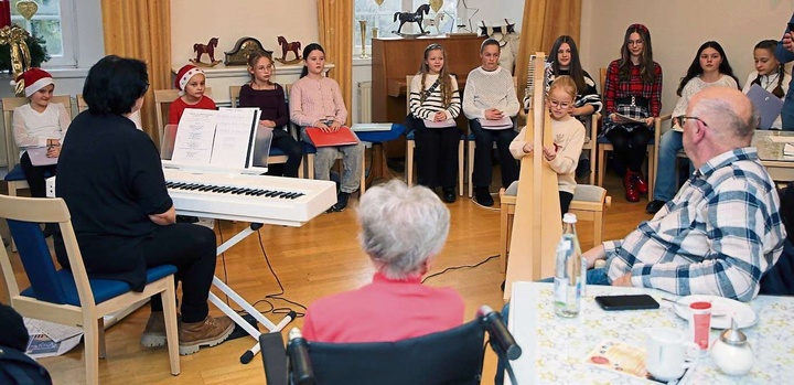 | Die „Schäfer-Mädels“, instrumental begleitet von Christa Schäfer am Piano und Lotti an der Harfe, sangen im Schloss-Saal. |