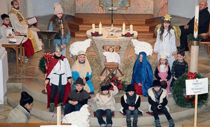 | Beim Krippenspiel schlüpften Kinder in die Rolle von Maria und Josef sowie Hirten, Engel, Soldat und Herbergswirte. |