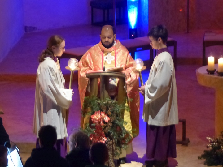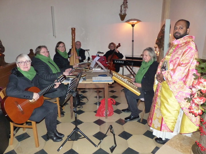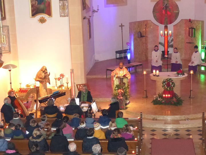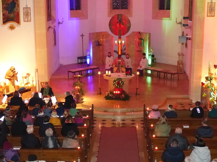 | Pfarrer Justine Chakkiath zelebrierte den Rorate-Gottesdienst, den die „Mallersdorfer Saitenspringer“ musikalisch umrahmten. |