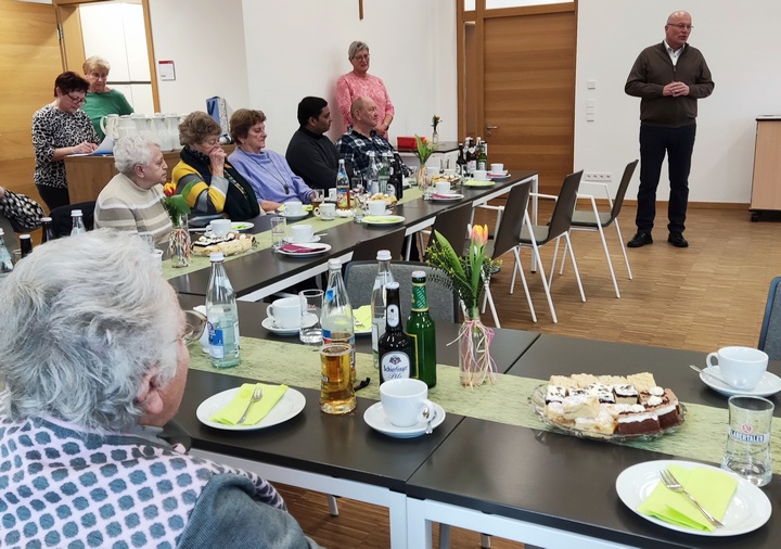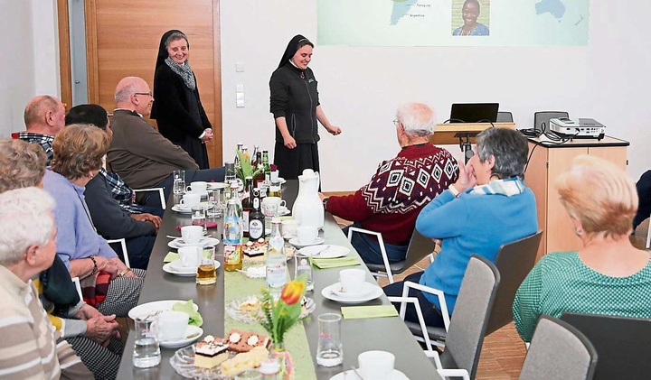 | Schwester Rosina Ernst und Schwester Maria Jehle (stehend von links) referierten beim Ü60-Café über ihre Arbeit und die ihrer Ordensgründerin. |