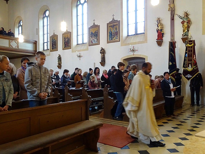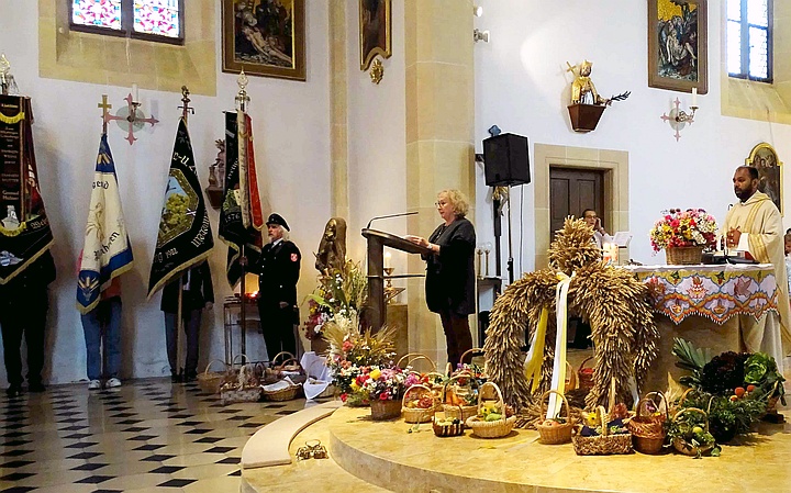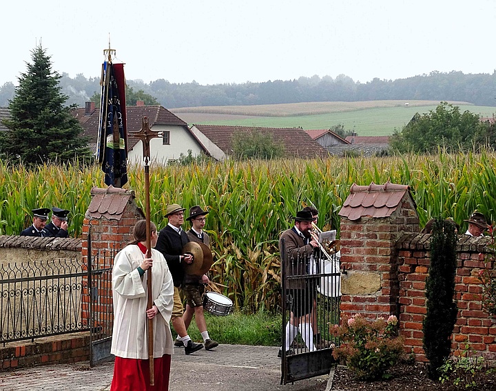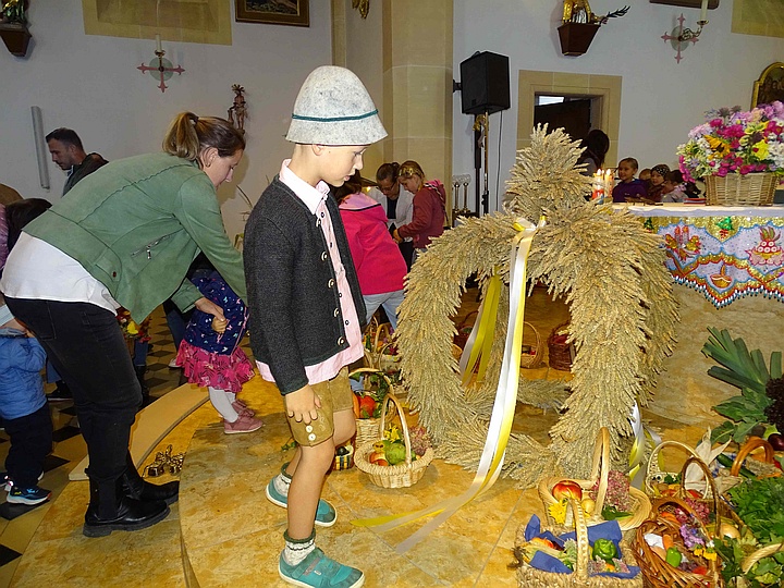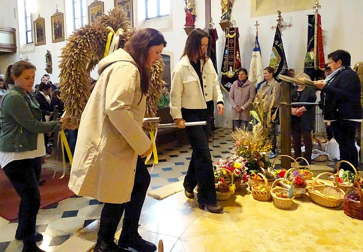 Aus Wertschätzung gegenüber der Natur, den Menschen und dem Schöpfer wurde am letzten Sonntag im September in der Pfarrkirche Pinkofen ein stimmungsvolles Erntedankfest gefeiert, das Groß und Klein zusammenbrachte. Angeführt von der Blaskapelle „Schirelinga“ und den Vereinen führte der Festzug vom Dorfgemeinschaftshaus zur Kirche. Körbe mit Blumen und Kräutern, Obst, Gemüse, Brot und Kuchen aus den Filialgemeinden und die Erntekrone aus Pinkofen wurden in die Kirche getragen. |