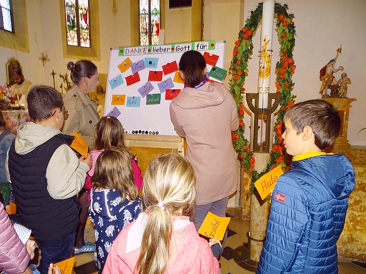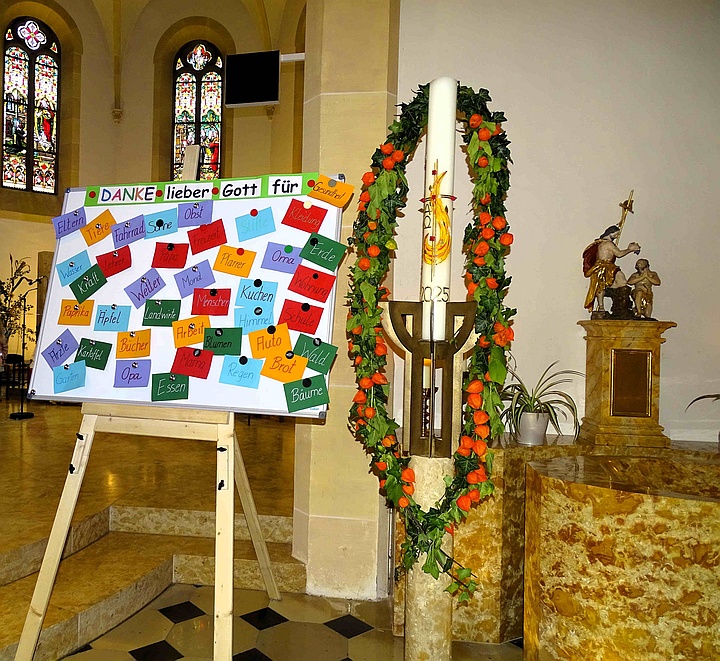 | Die Kinder gestalteten beim Gottesdienst eine „Dankeschön-Tafel“. |