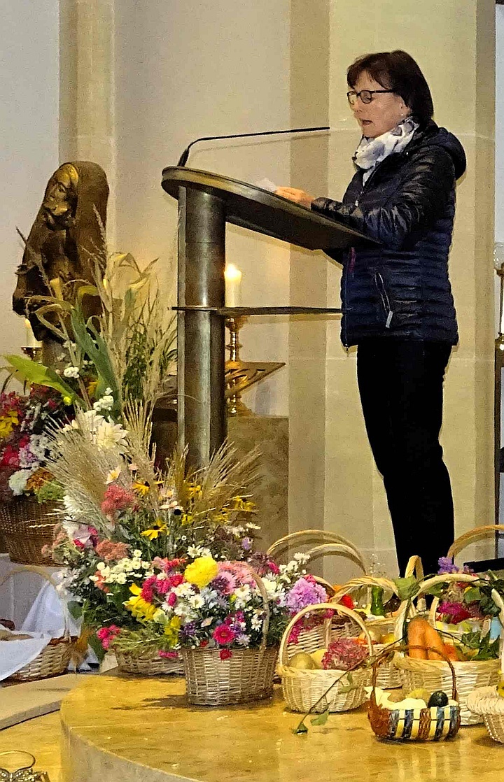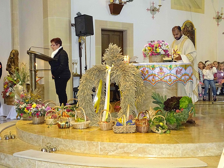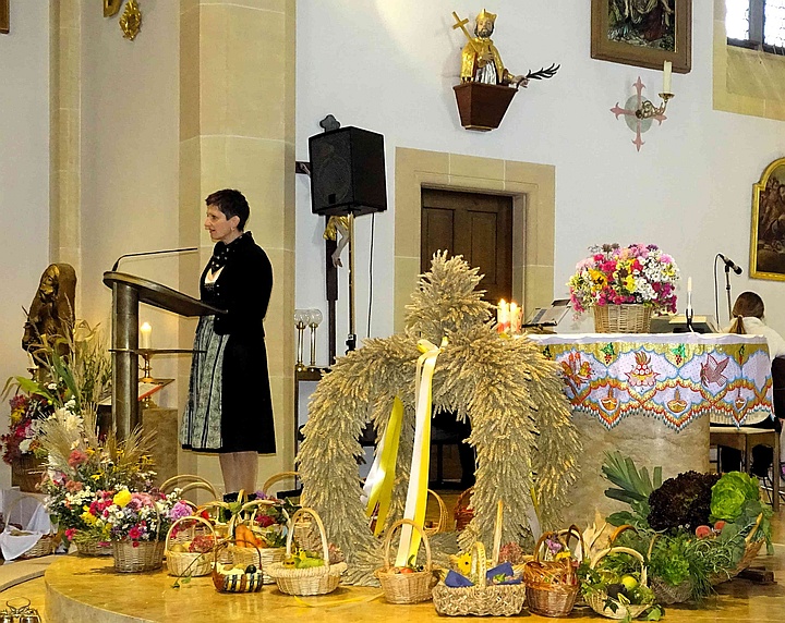 In der Kirche entstand ein reich gedeckter Altar, der die ganze Fülle der diesjährigen Ernte zeigte. Das Team Familiengottesdienst mit Gudrun Ludsteck, Helene Schmauser, Renate Brattinger, Andrea Rosenwirt, Veronika Beck, Steffi Albrecht und Rita Heiß hatte viel Zeit in die Vorbereitung des Erntedank-Gottesdienstes investiert. |