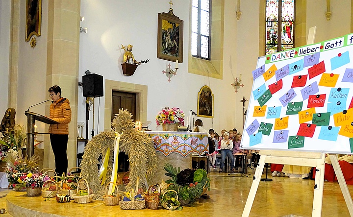 Auch die Kinder brachten mit bunten Karten ihre Dankbarkeit zum Ausdruck. Jedes Kind durfte dazu eine Karte nach vorne bringen und an die „Dankeschön-Tafel“ heften. Musikalisch trug der Kinderchor unter der Leitung von Elena Hofmeister und Veronika Hornung mit fröhlichen Liedern zum feierlichen Charakter bei, ebenso Bernhard Brattinger an der Orgel. |