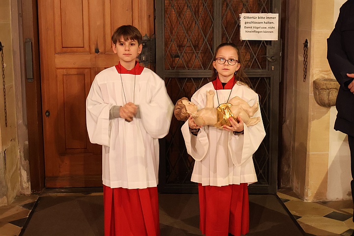 | In der nächtlichen Christmette brachten die jüngste Ministrantin und der jüngste Ministrant das Christkind zur Krippe. |