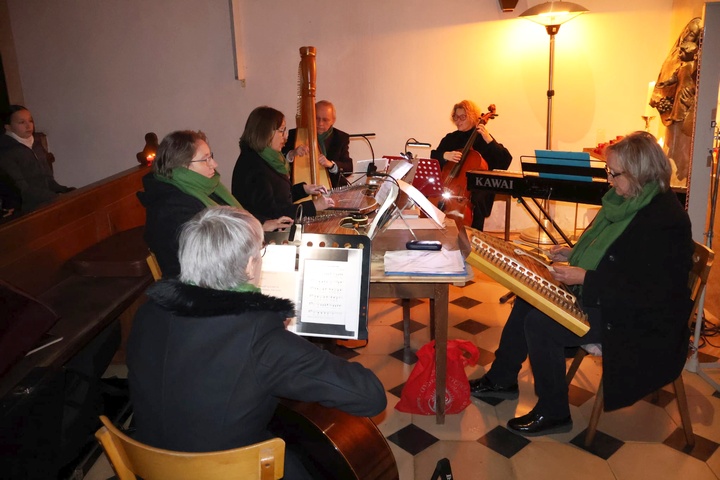 | Pfarrer Justine Chakkiath dankte den „Mallersdorfer Saitenspringern“ für die stimmungsvolle musikalische Umrahmung des Rorate-Gottesdienstes. |